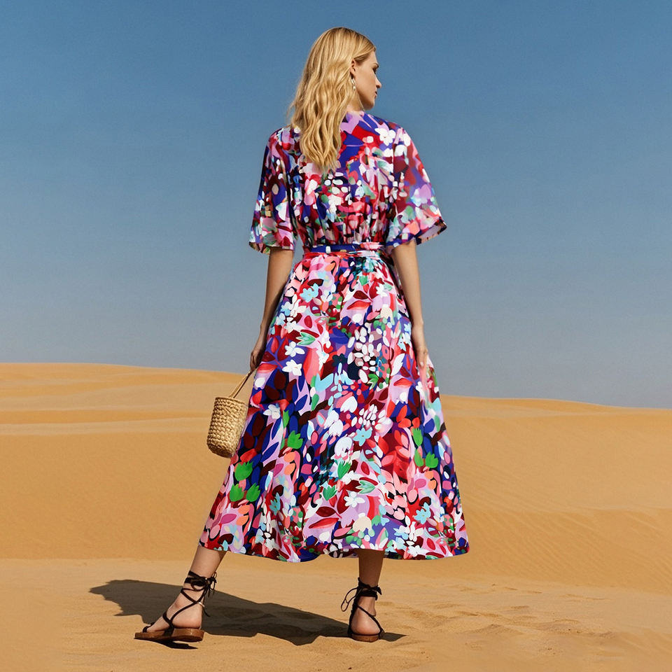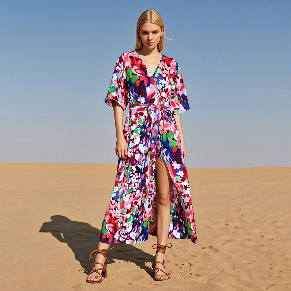 Vestido de mujer con abertura alta y estampado completo, Vestido largo de manga corta con cinturón de tela