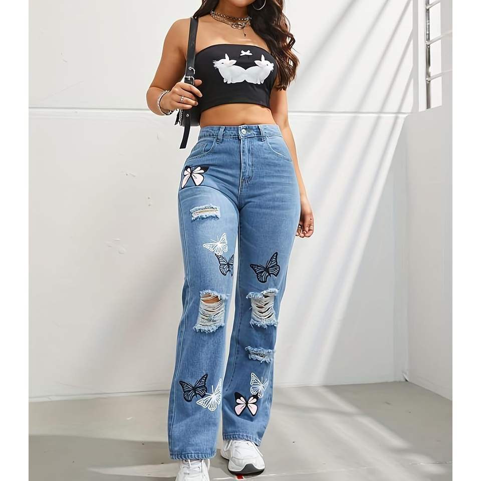 Pantalones vaqueros de pierna recta desgastados con mariposa de cintura alta para mujer, pantalones vaqueros rasgados holgados para chicas adolescentes, diseño transpirable