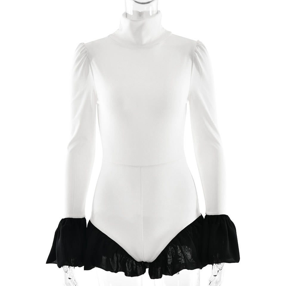 Body de punto para mujer con volantes, corte ajustado, manga larga, cuello alto, patchwork blanco y burdeos, moda otoño-invierno