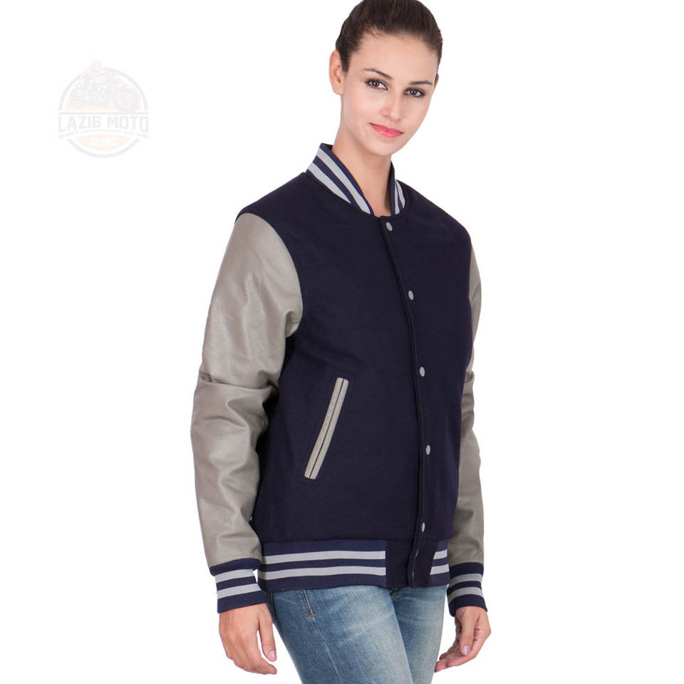 Chaquetas universitarias de última moda para mujer Diseño de doble color con mangas de cuero tejido Ropa de invierno Servicio OEM