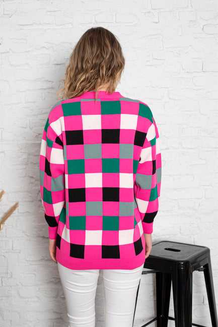 Cárdigan de Punto con Botones y Estampado Cuadrado de Manga Larga para Mujer, con Colores Vibrantes, Moda Otoño/Invierno, Casual, Oficina, Venta al por Mayor