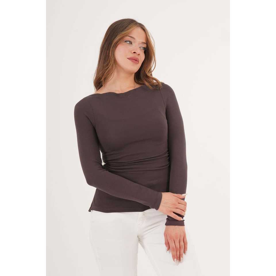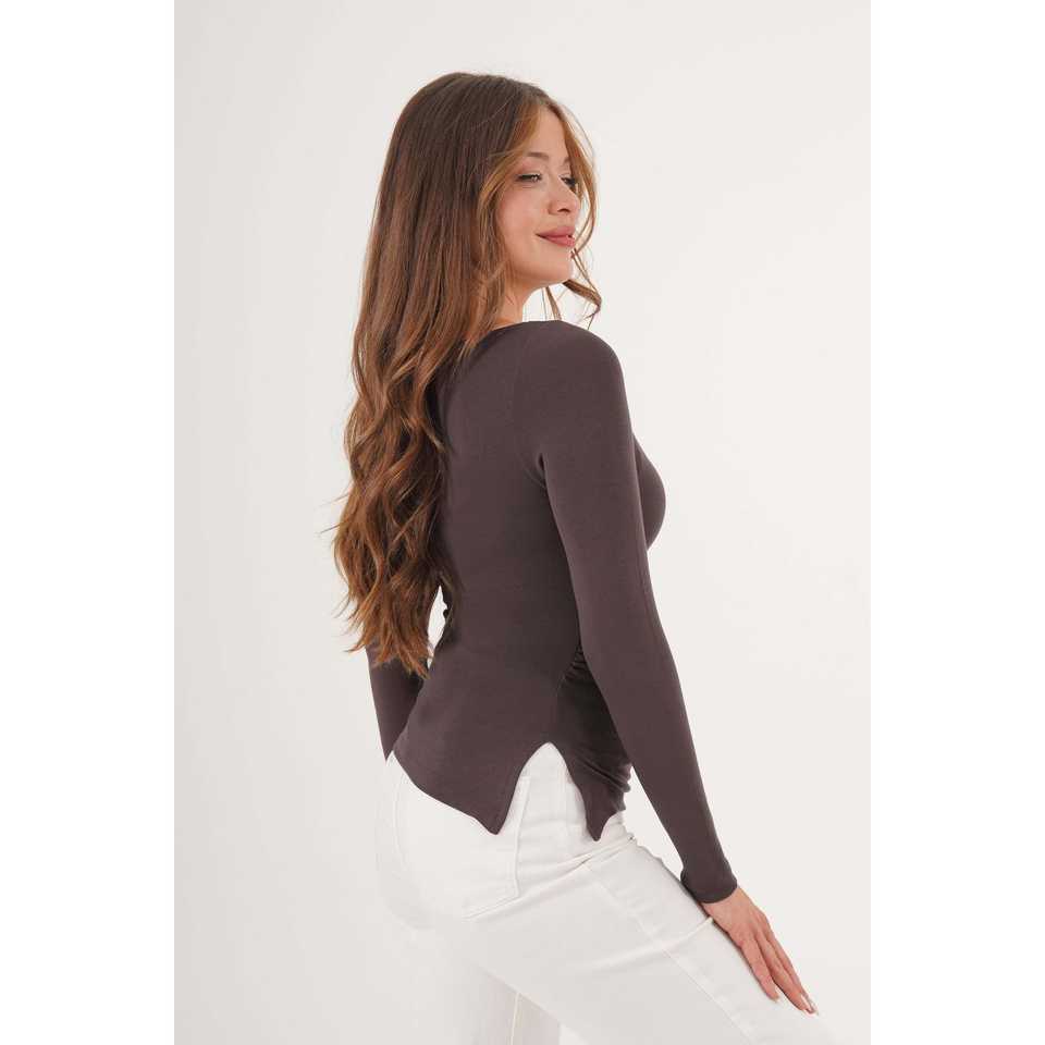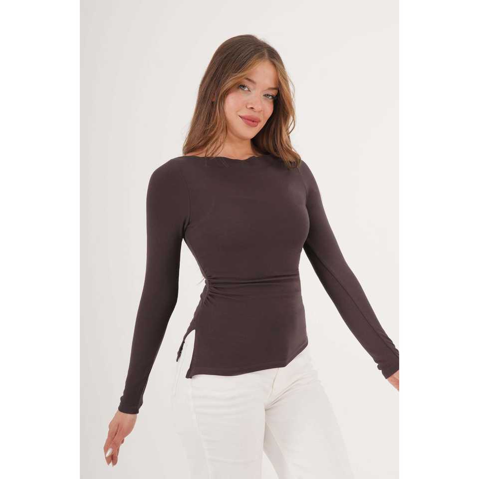 Blusa Marrón de Manga Larga para Mujer con Abertura Lateral (Venta al Por Mayor)