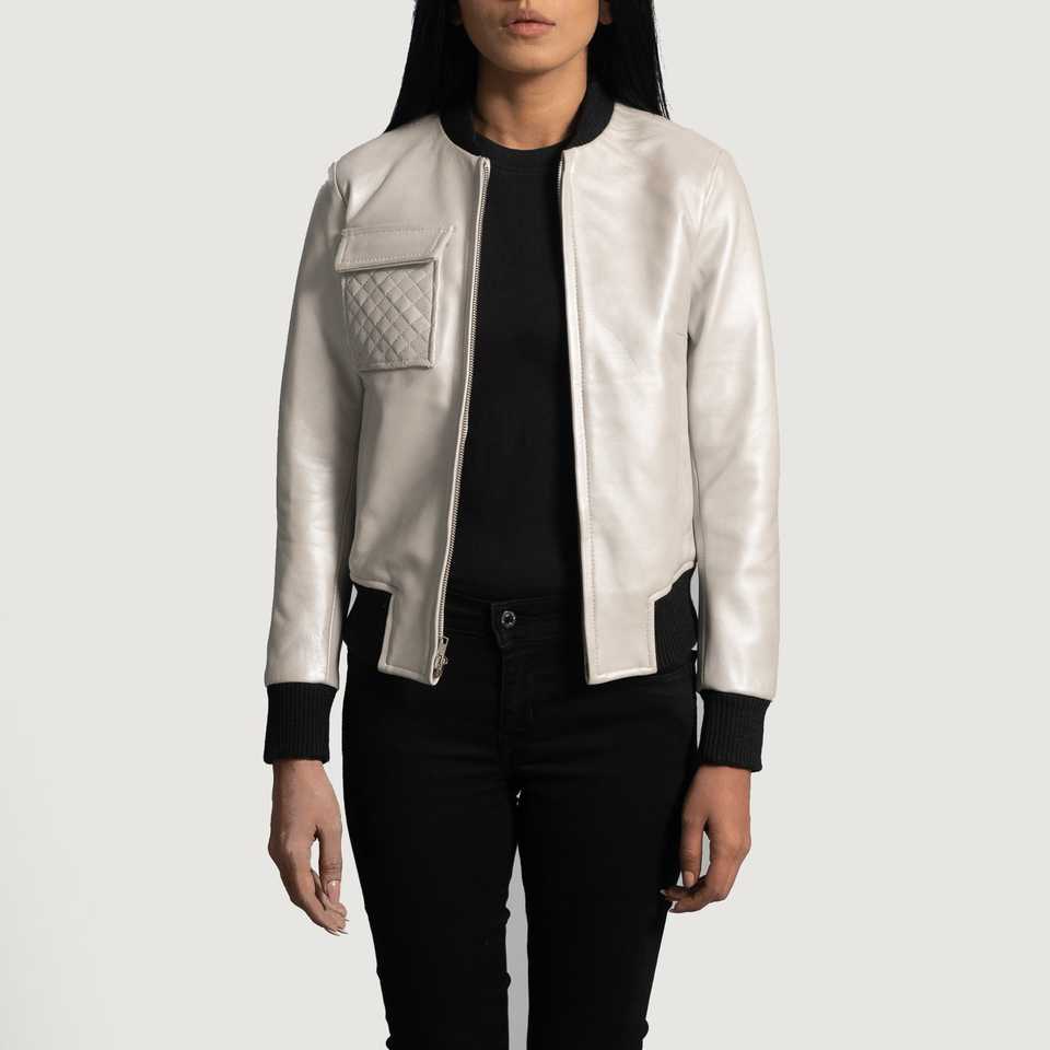 Chaqueta moderna de piel de vaca para mujer, chaqueta con cremallera, diseño acolchado, cuello levantado, estilo béisbol frontal, chaqueta Bomber de corte moderno, Blanca
