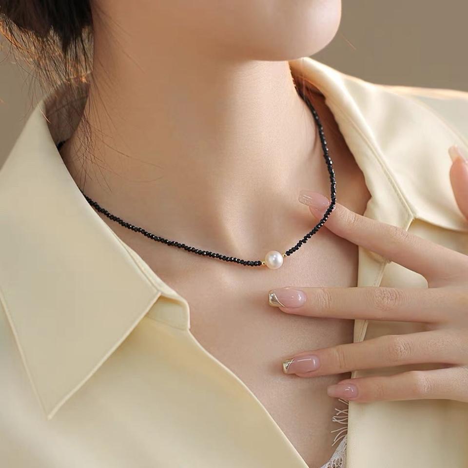 Collar de Perlas Naturales para Mujer con Cadena de Cristal Negro, Diseño de Nicho, Collar de Temperamento, Collar de Moda con Cuentas
