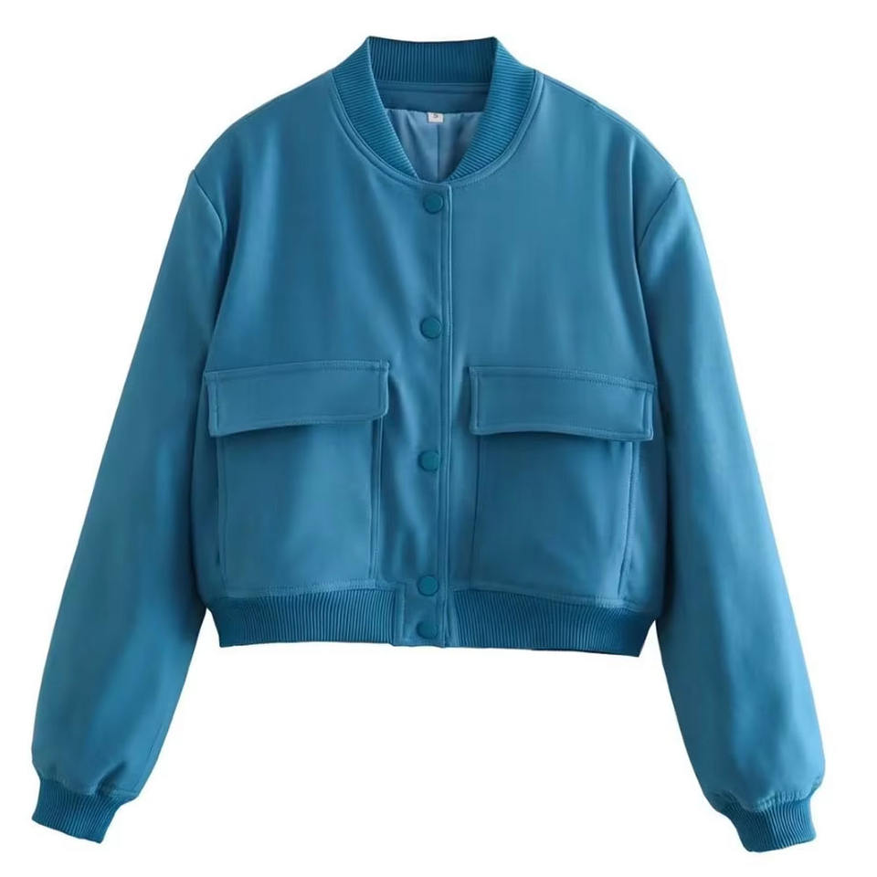 Chaqueta de béisbol de primavera y otoño para mujer, cortavientos informal con cuello levantado, diseño de botón de Bolsillo grande, corto de seda transpirable
