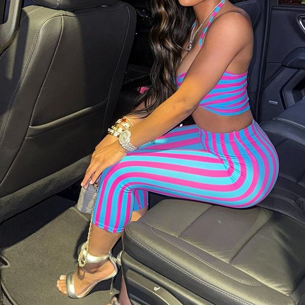 Conjunto de 2 Piezas para Mujer, Estilo Moderno, Top Halter a Rayas con Bloques de Color y Pantalones Capri Ajustados
