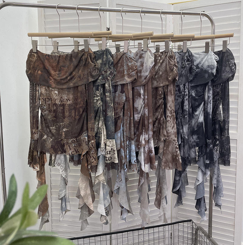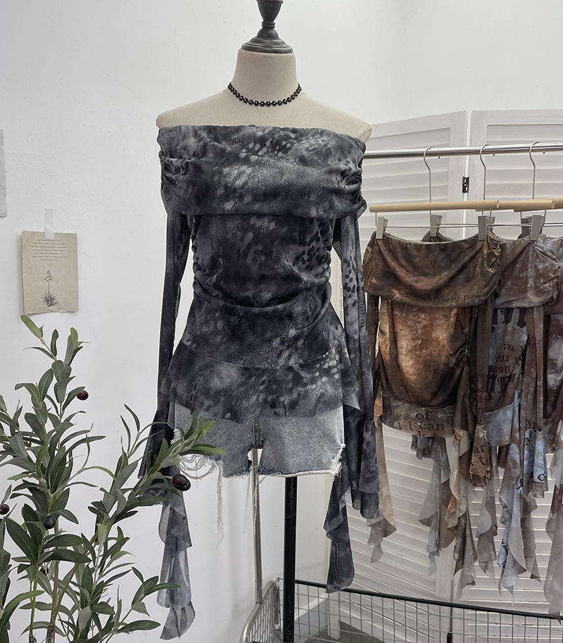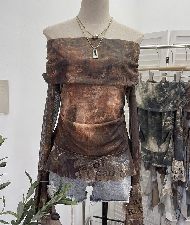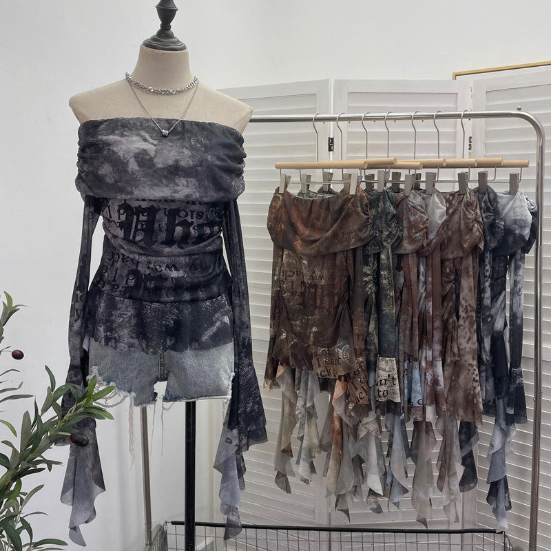 Blusa de malla con estampado tie-dye y lazo en el hombro para mujer, con camiseta de manga larga plisada, a la moda