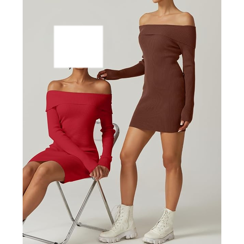 Vestido de suéter de punto acanalado con hombros descubiertos para mujer, minivestido de manga larga con cuello doblado, trajes de Otoño de moda 2025