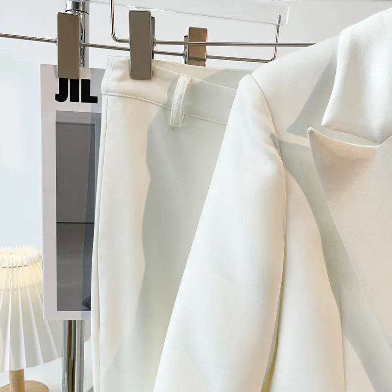 Conjuntos de traje de fiesta de negocios de oficina para mujer Blazer y pantalones blancos Chaqueta de solapa de manga de plumas reales de un solo botón Diseño de dos piezas