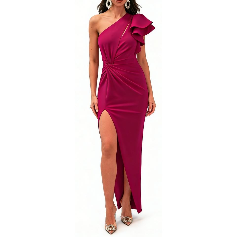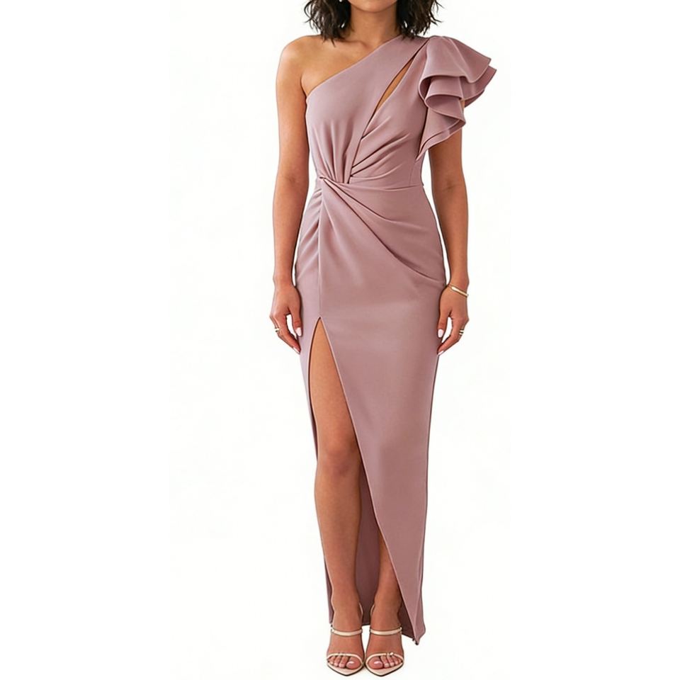 Vestido Maxi de un Solo Hombro con Volantes para Mujer, Vestido Ajustado con Abertura Frontal para Eventos Formales y de Noche