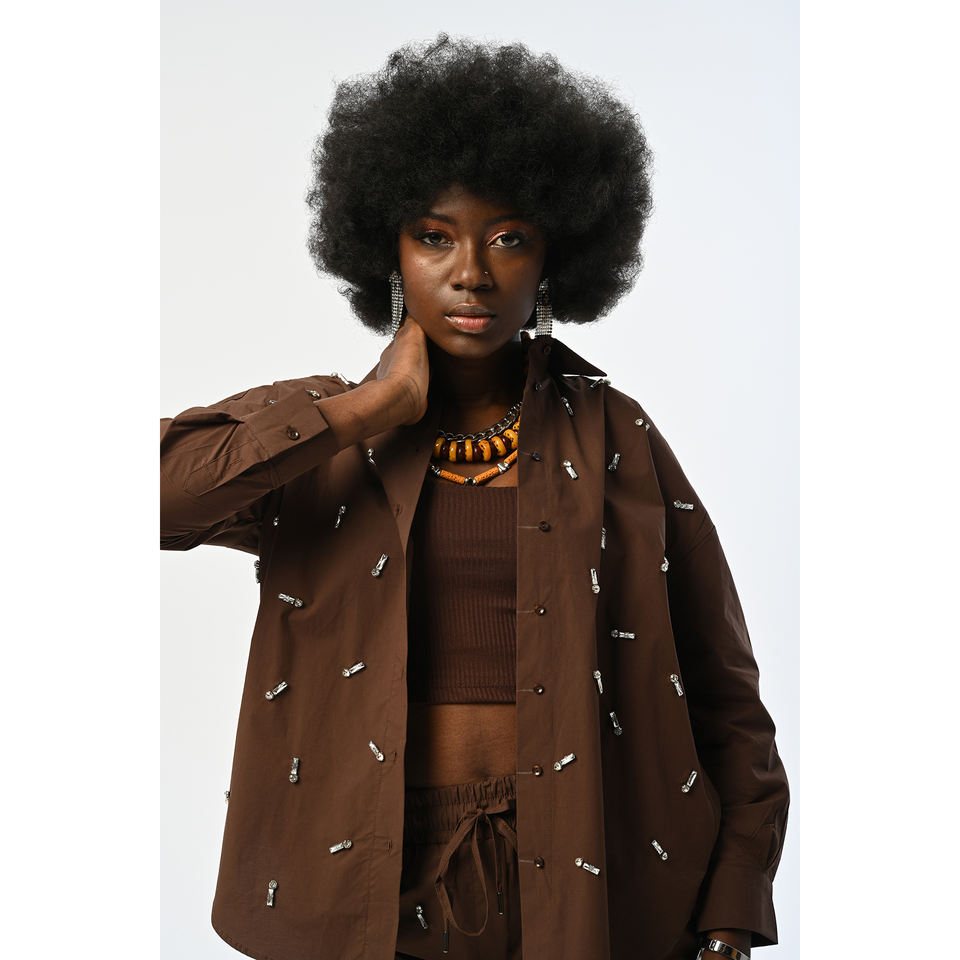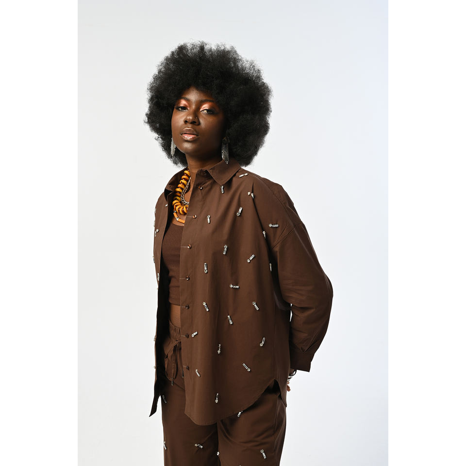 Camisa Marrón Extra Grande para Mujer con Diseño de Adornos de Piedras en la Parte Delantera