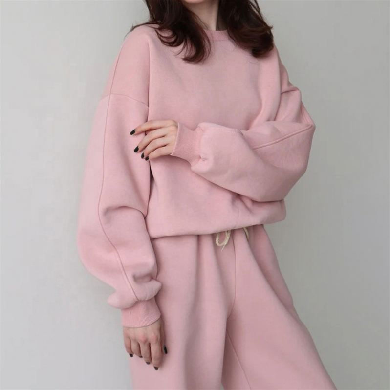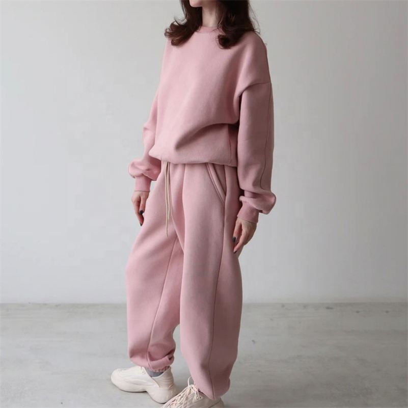 Conjunto de pantalones de chándal de cuello redondo de gran tamaño para mujer, chándales personalizados de otoño al por mayor, chándal acogedor de lana ecológico