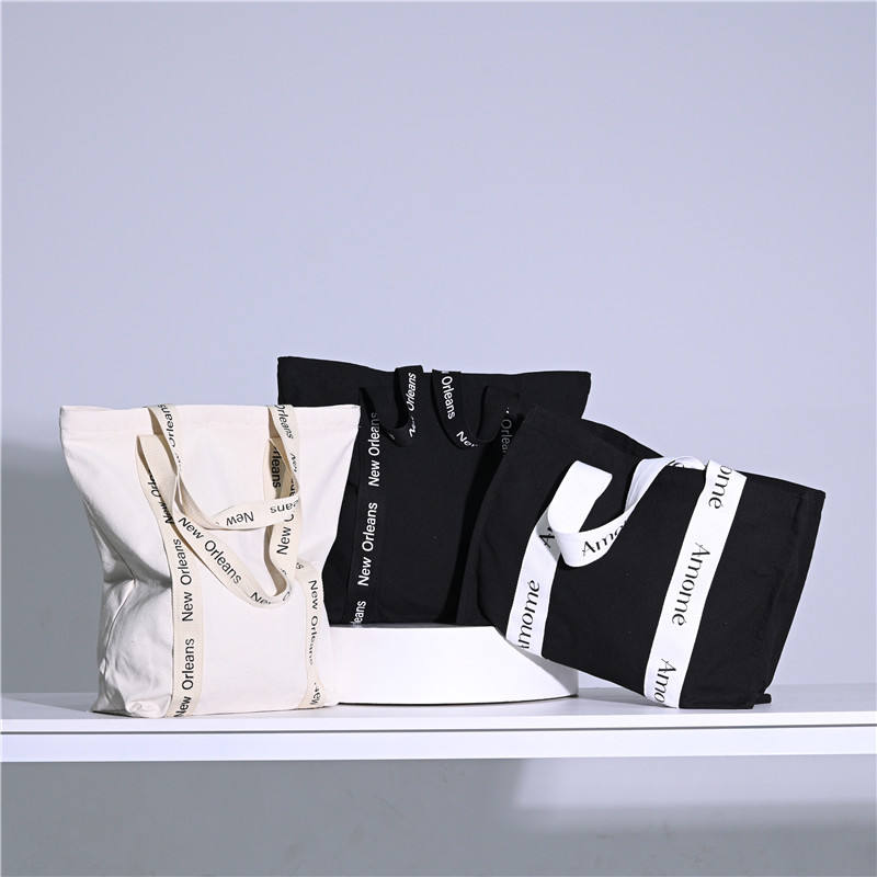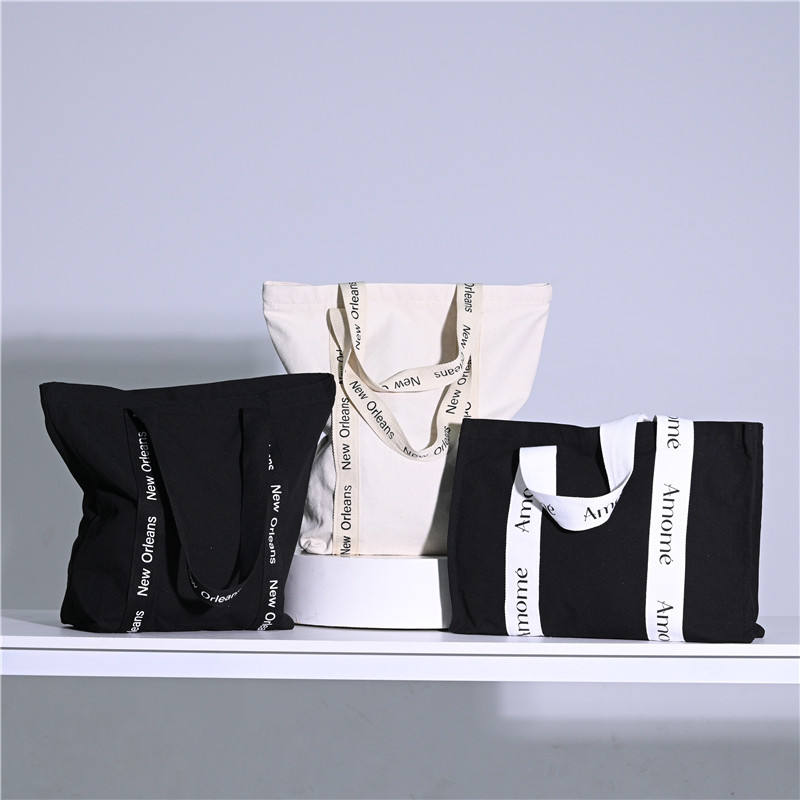 Bolso de compras de algodón de lona de Fin de Semana Grande de gran tamaño para mujer negro con logotipo personalizado Patrón de letras de moda