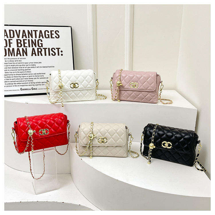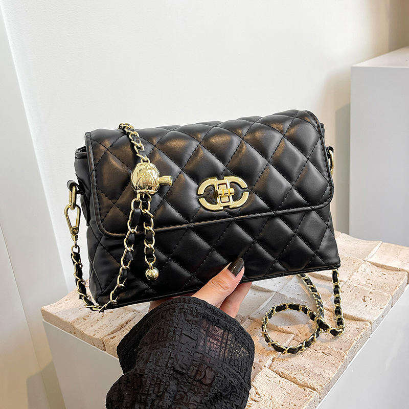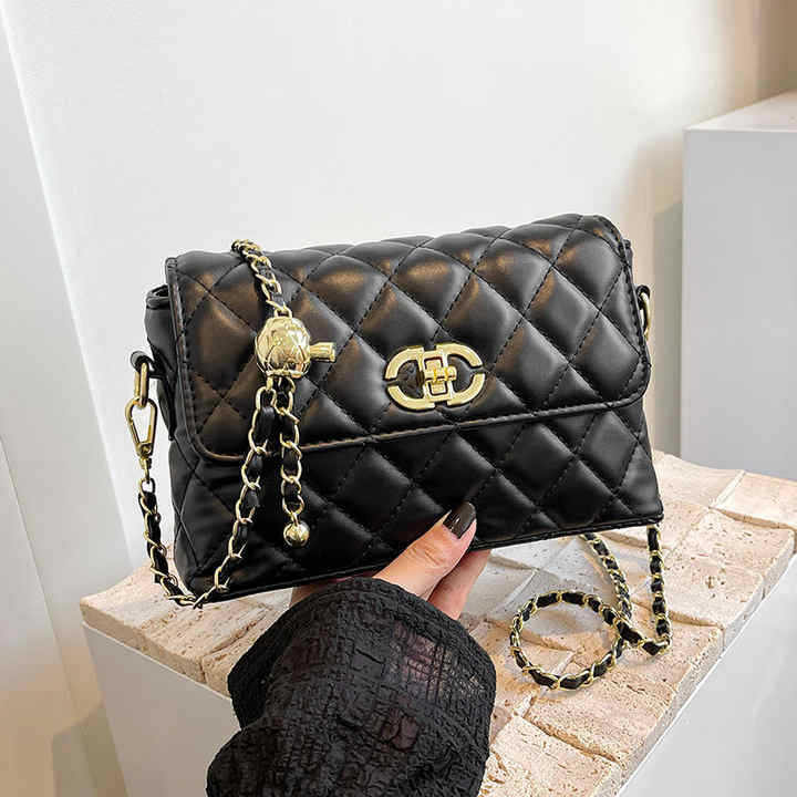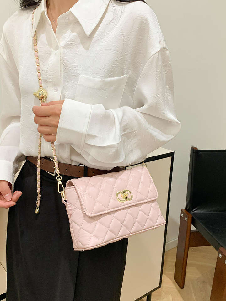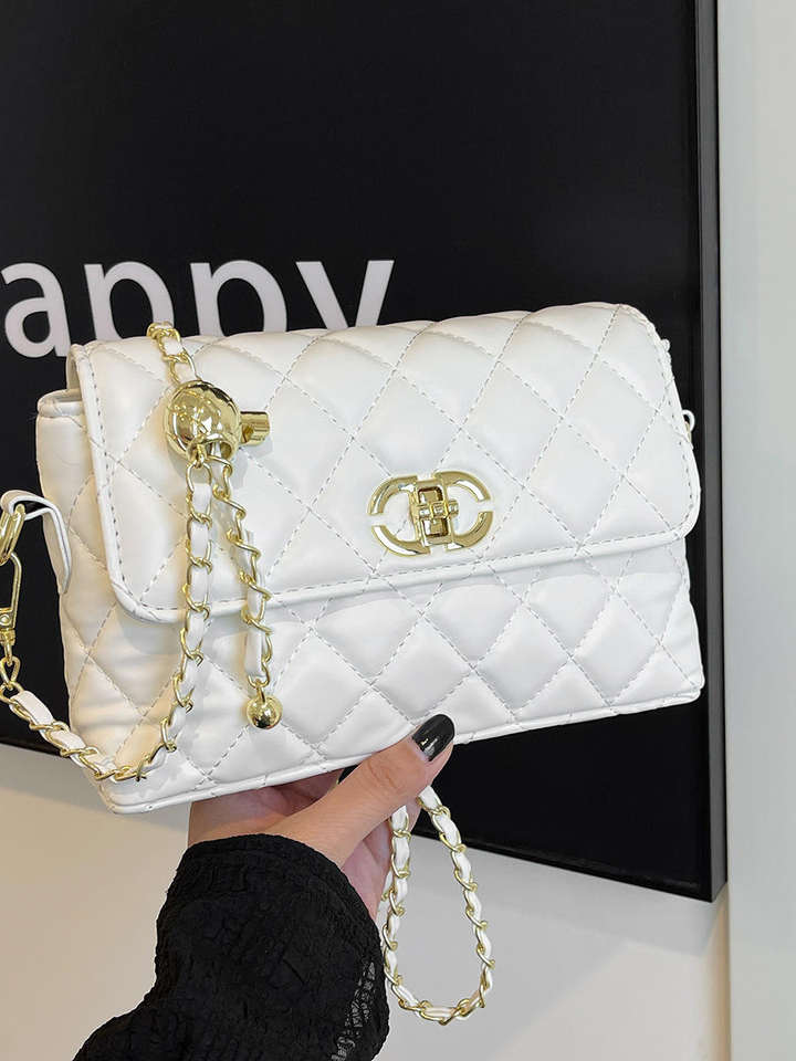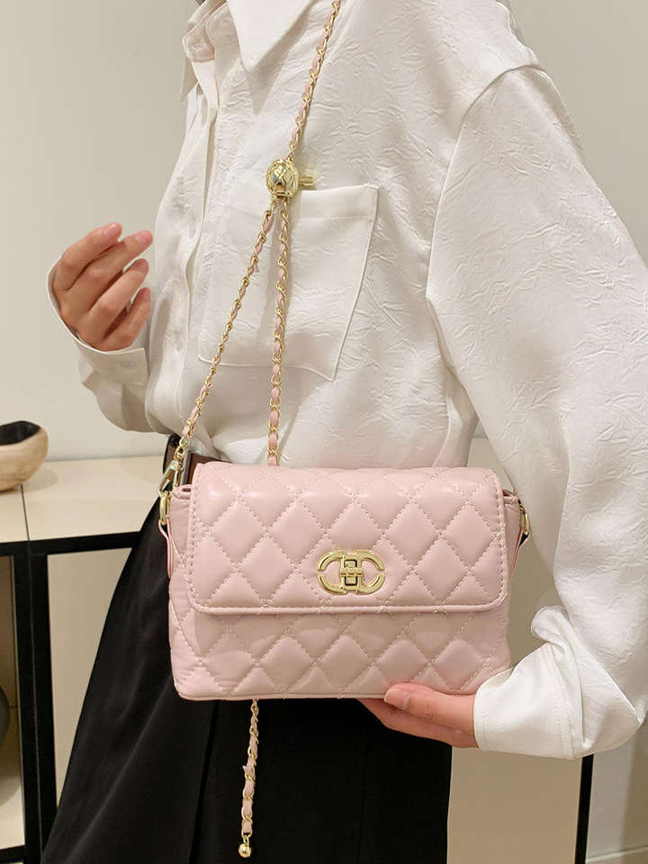 Bolso Bandolera de Mujer en PU y Poliéster con Patrón de Diamantes y Cadena, Diseño Geométrico de Moda, con Botón, Compacto, Versátil y Portátil