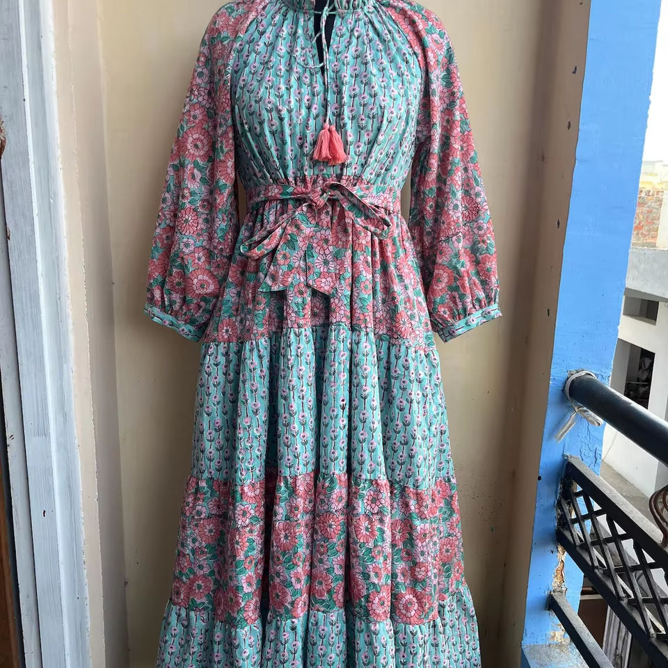 Vestido maxi de manga larga de talla grande para mujer, estampado en bloque, algodón, colores mezclados, ropa de verano con decoración de borlas, 100% algodón