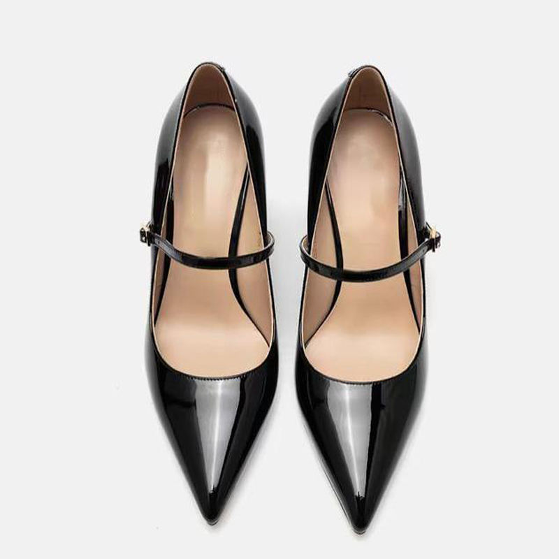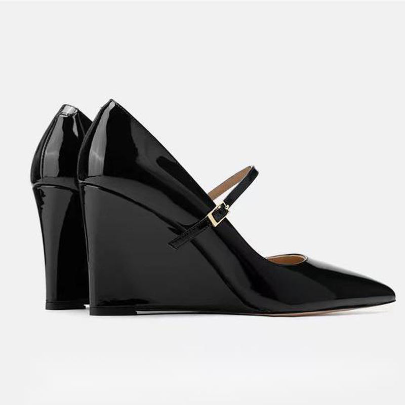 Sandalias de tacón alto con punta en pico y correa central con hebillas para mujer, zapatos de vestir de verano con tacón cubierto y charol, estilo sexy