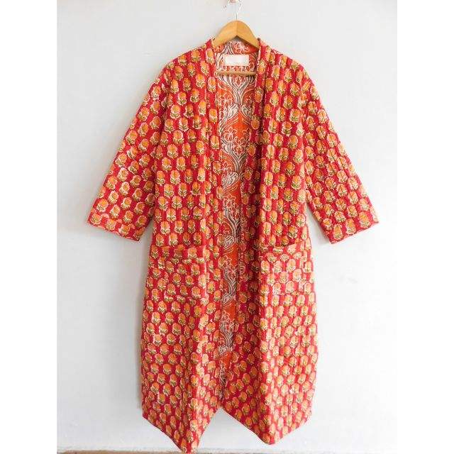 Albornoz tipo Kimono acolchado de algodón rojo para mujer, vestido Floral con estampado de bloques a mano, abrigo informal para invierno, verano y otoño primavera