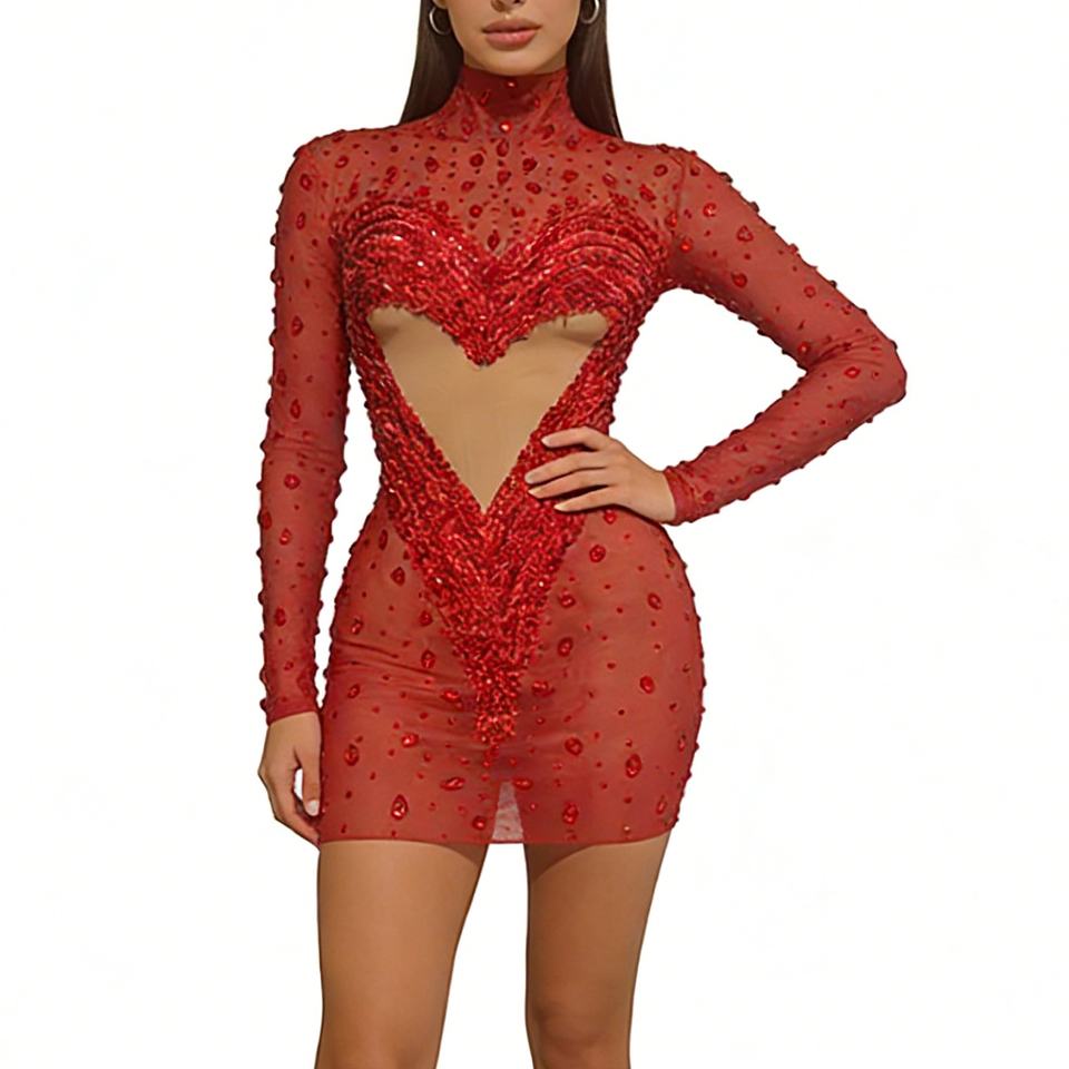 Vestido Mini Rojo de Mujer con Pedrería en Forma de Corazón, Malla Transparente, Cuello Alto, Manga Larga, Vestido de Fiesta, Vestidos de Noche, Moda