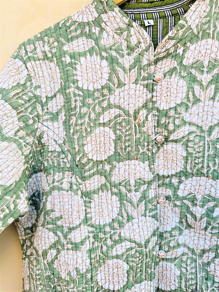Chaqueta acolchada de algodón con estampado de bloques florales reversibles para mujer, abrigo Bomber de manga larga con cuello en V de doble cara, estampado de bloques a mano