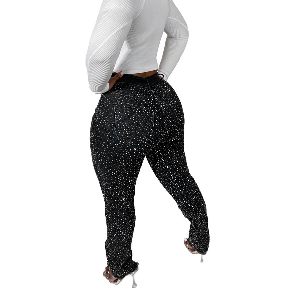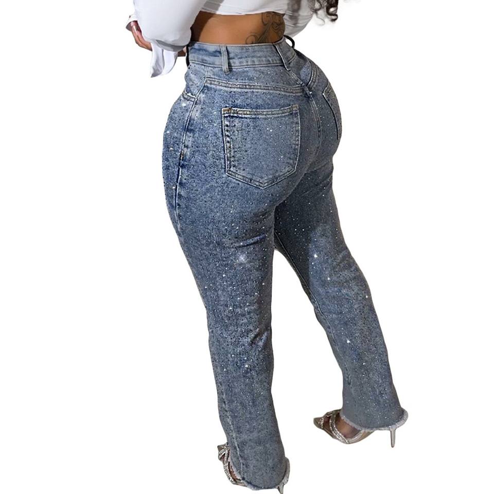 Jeans de mezclilla ajustados con pedrería, bolsillos y detalles desgastados para mujer