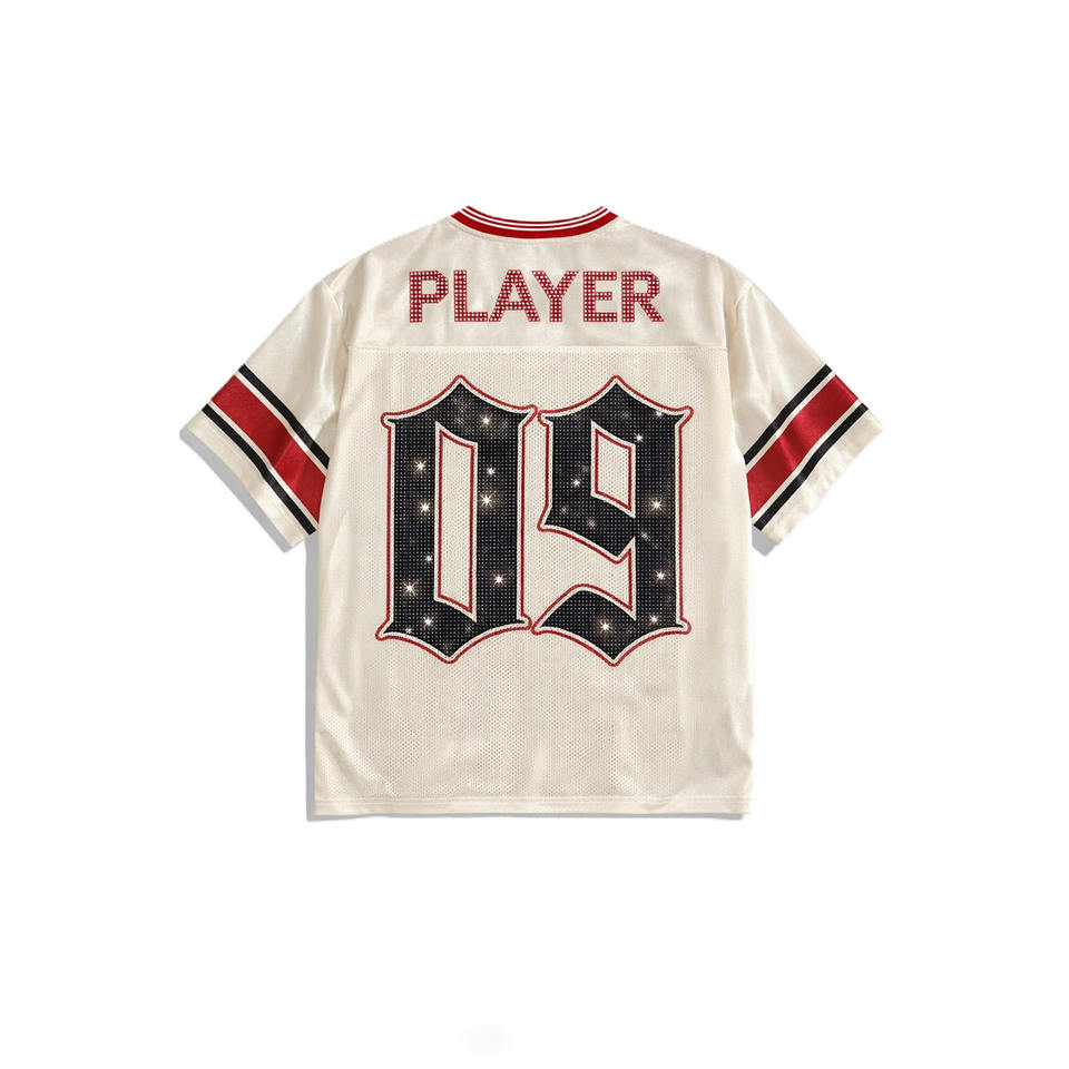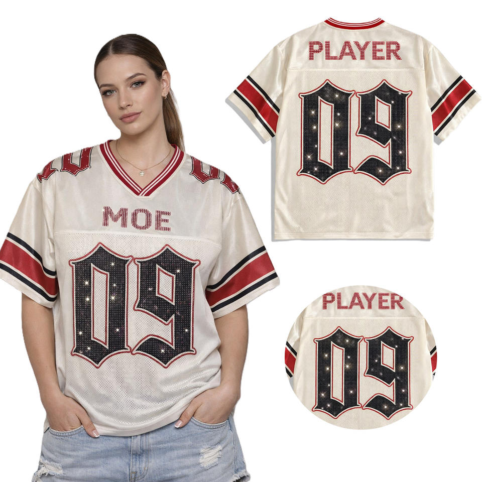 Camiseta de fútbol americano gótica con diamantes de imitación para mujer, de malla, transpirable, de poliéster, con cuello en V, estilo urbano, uniforme de equipo, OEM