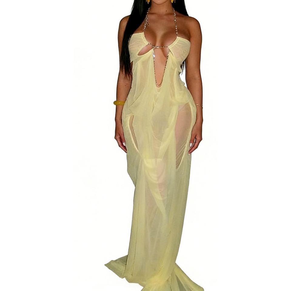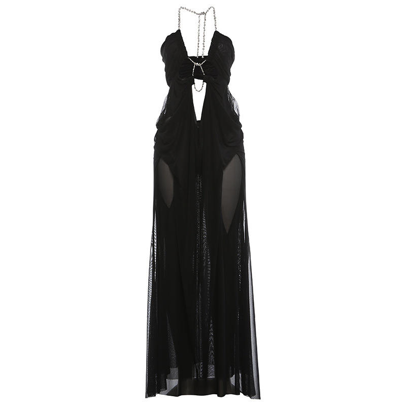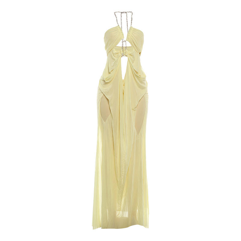 Vestido largo de mujer con cuello halter de pedrería, malla transparente y abertura alta, a la moda