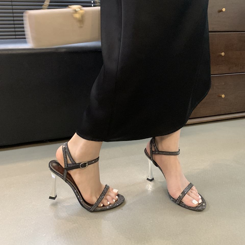Sandalias de Tacón Alto con Pedrería para Mujer, Estilo Extranjero, Punta Abierta, Tacón Delgado, Verano 2024
