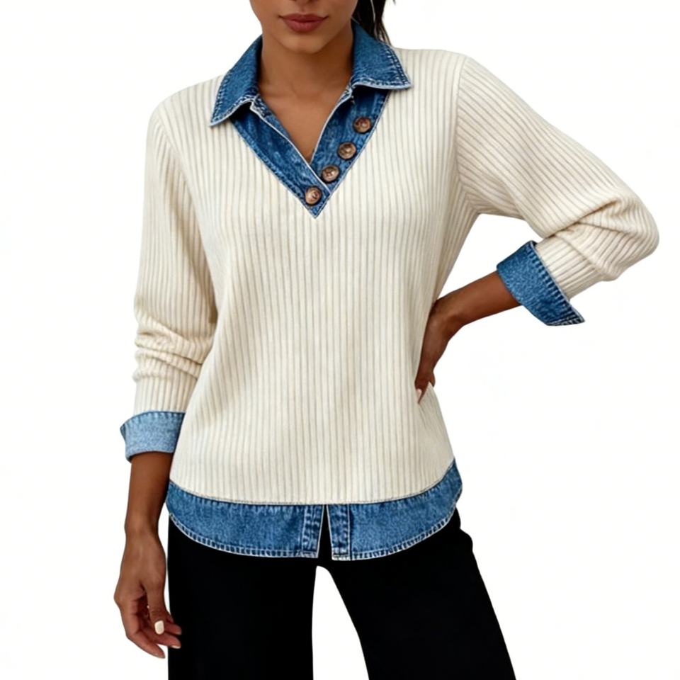 Camiseta de Punto Acanalado para Mujer con Detalles en Mezclilla - Top de Manga Larga con Cuello en V y Botones, a la Moda