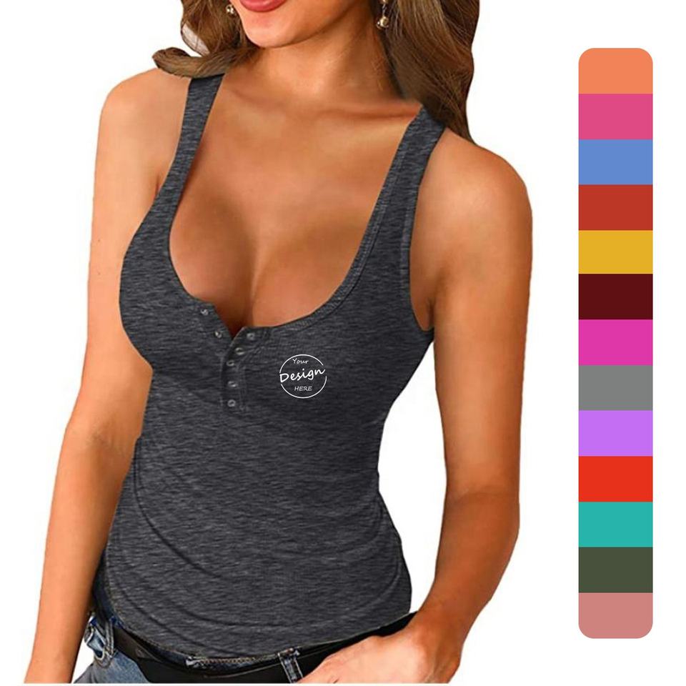 Camisetas sin mangas acanaladas con cuello en U para mujer, top liso sin mangas, logotipo personalizado, 95% algodón peinado, 5% elastano, ajuste ceñido, camisetas sin mangas con botones