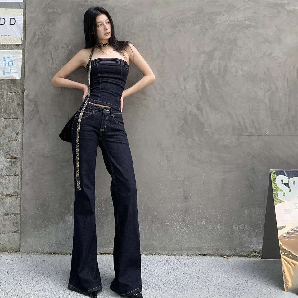 Conjunto conjunto de mezclilla elástica índigo rígido para mujer Top corto Bandau y pantalones vaqueros bootcut de tiro bajo