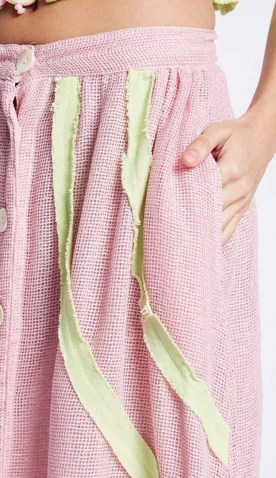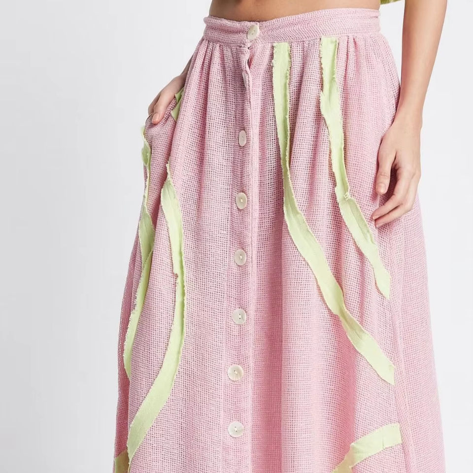Maxi falda acampanada Rosa ondulado para mujer, estilo informal de algodón transpirable con decoración bordada, cintura Natural