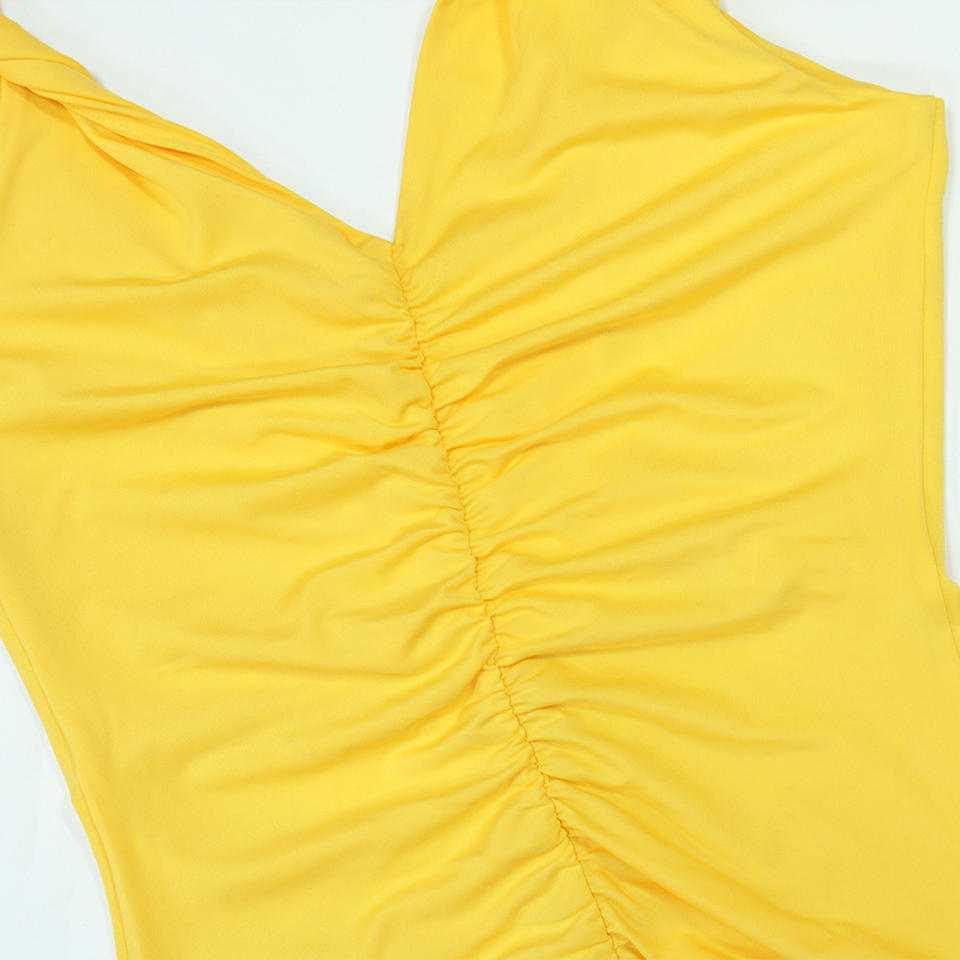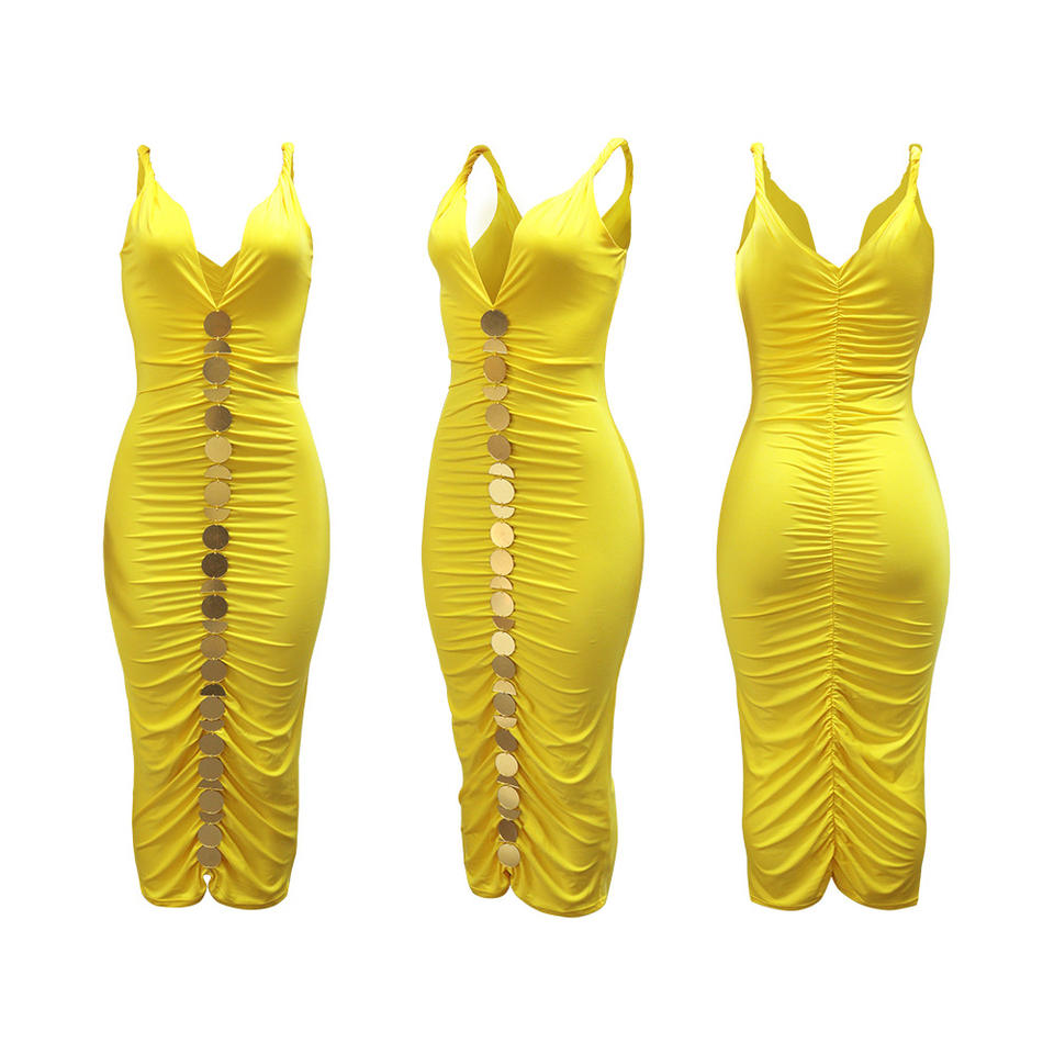 Vestido midi ajustado fruncido para mujer con tirantes finos, cuello en V y detalle de disco dorado - Moda