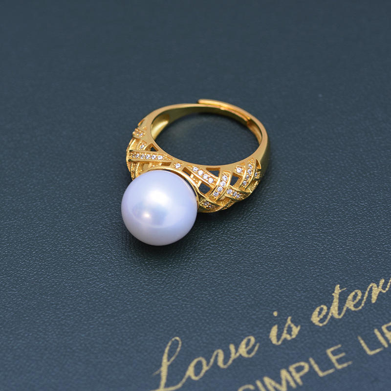 Anillo de Plata S925 con Perla de Agua Dulce para Mujer, Perla Redonda Blanca de 11-12 mm, Luz Intensa, Diseño Hueco Ajustable