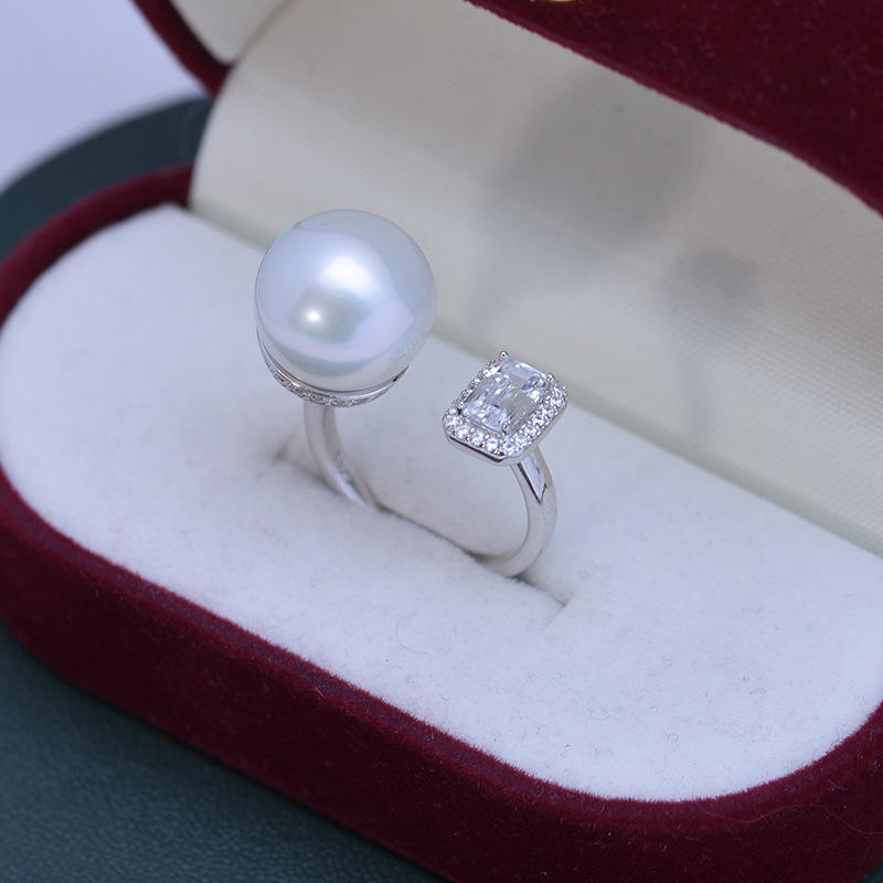 Anillo Abierto de Plata S925 para Mujer, Estilo Azúcar, con Perla de Agua Dulce de 12-13 mm, Blanca, de Luz Intensa, Casi Impecable, Anillos de Diamantes
