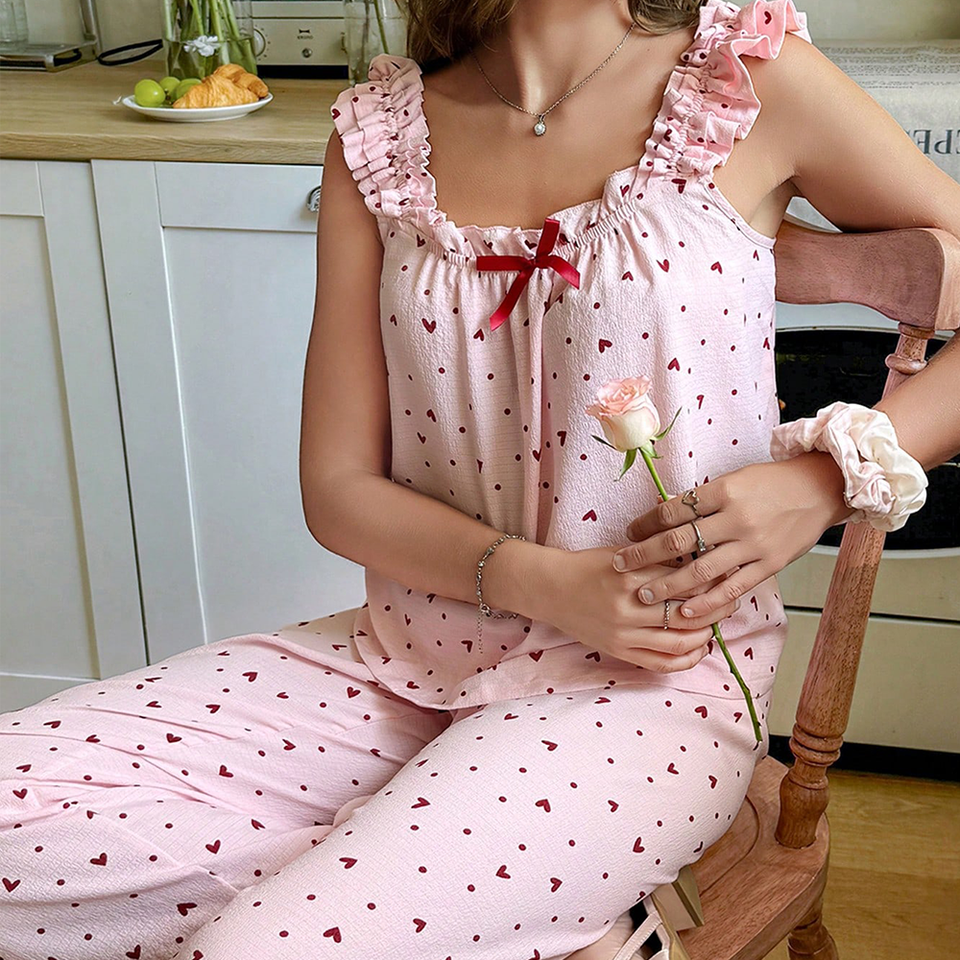 Conjunto de Pijama sin Mangas para Mujer con Volantes y Tirantes, de Algodón Modal, Estampado de Corazones Rosas, Ropa de Dormir Suave con Dobladillo con Volantes