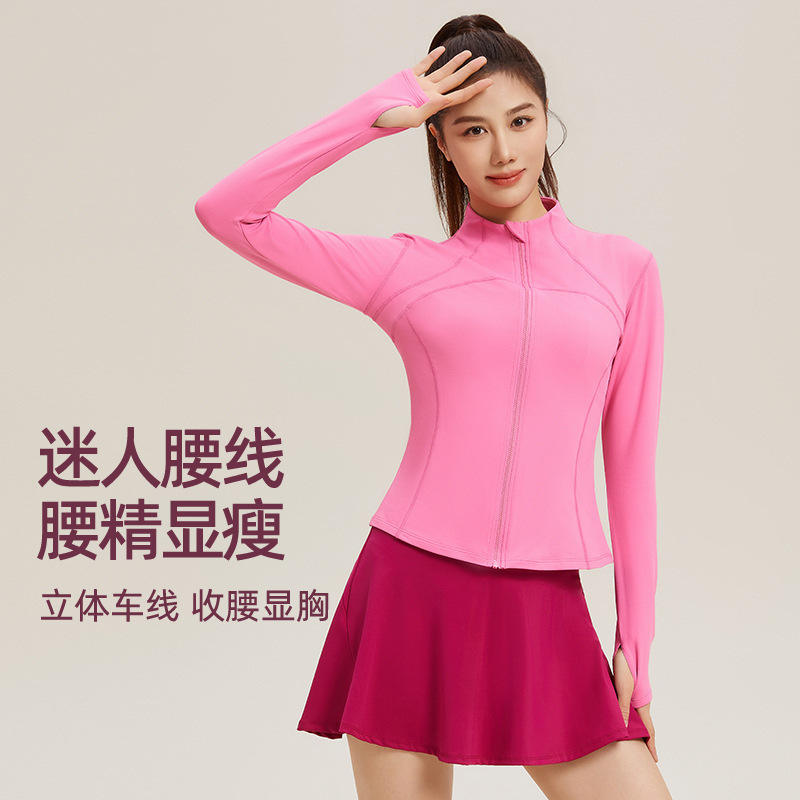 Chaqueta deportiva de manga larga ajustada para mujer para primavera y otoño, cuello levantado con cremallera y camisetas elásticas para Yoga