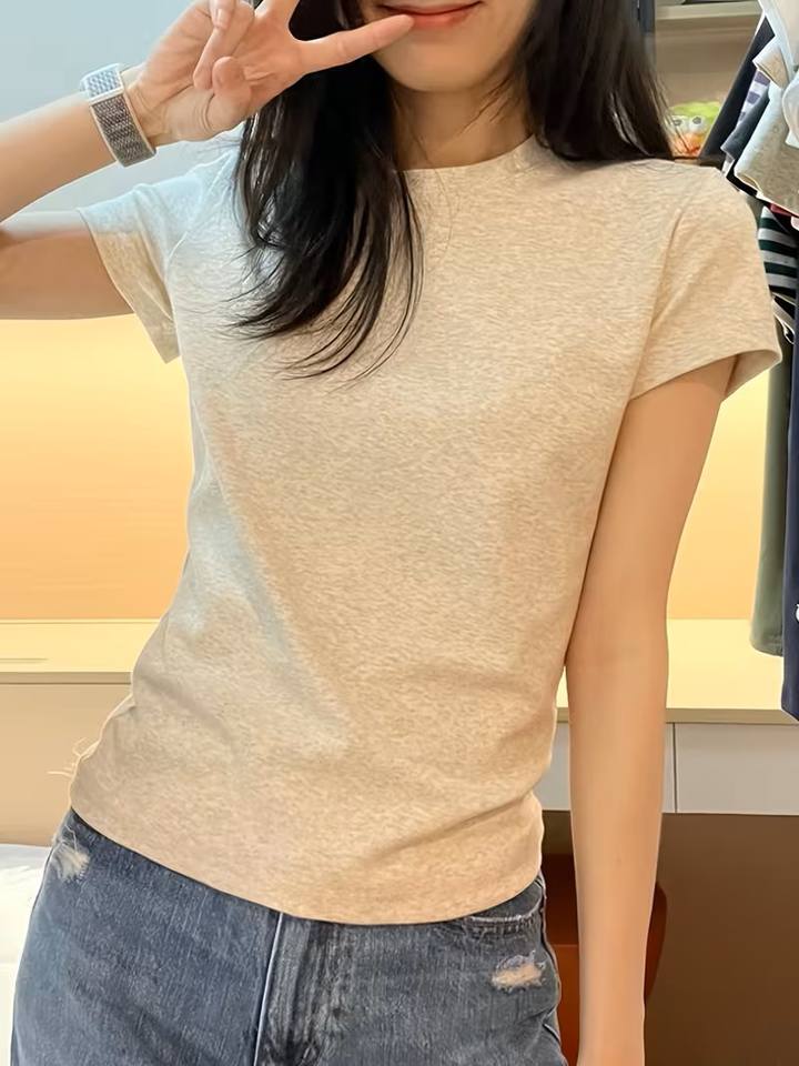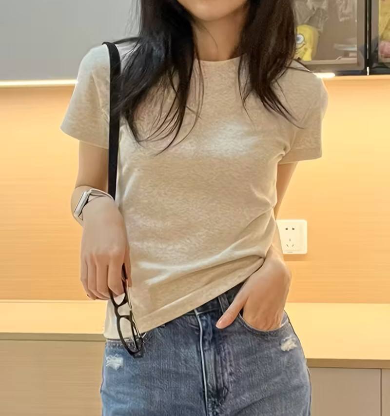 Camiseta de Cuello Redondo para Mujer, Color Sólido, con Logotipo, Ligera y Cómoda, Antiarrugas, para Primavera/Verano, Casual y Deportiva