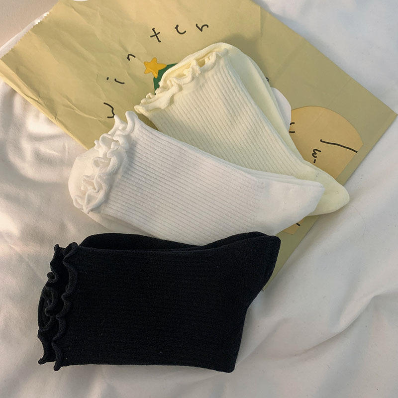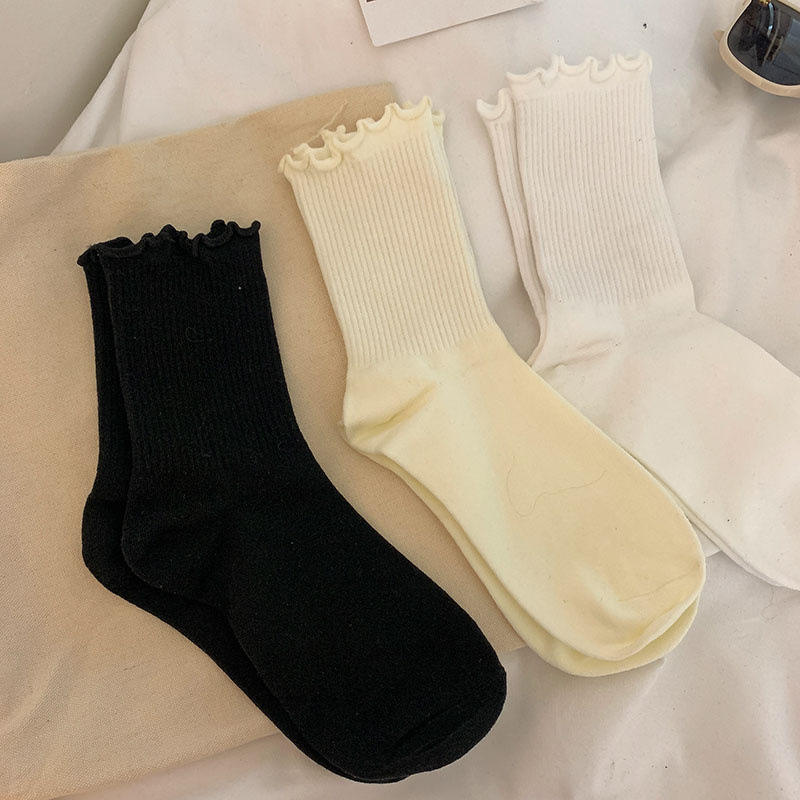 Calcetines de mujer de color sólido con ribete de volantes, calcetines transpirables hasta la pantorrilla para jóvenes a la moda.