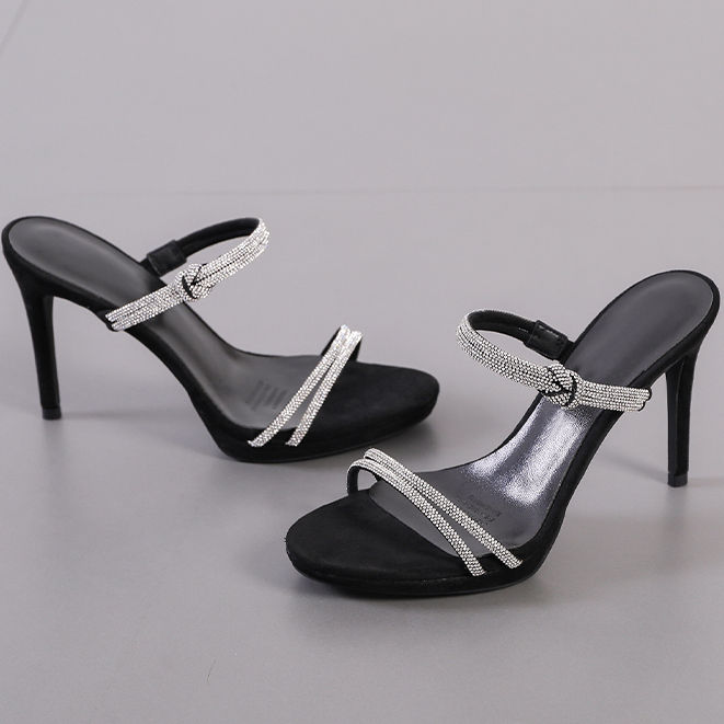 Sandalias de tacón alto con punta abierta para mujer, estilo stiletto, con diamantes de imitación, antideslizantes, nuevas, de 22 mm, tipo pantuflas de una tira.
