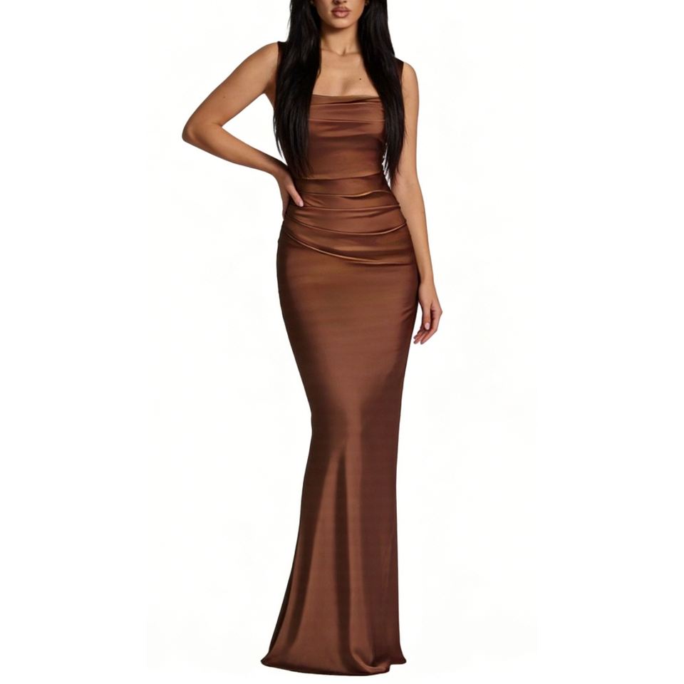 Vestido Maxi Fruncido con Cuello Cuadrado para Mujer - Vestido Formal Ajustado con Tirantes Metálicos a la Moda