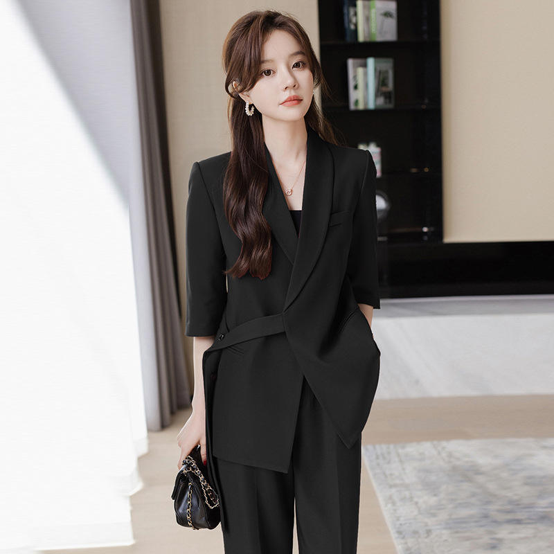 Women's Suit Set Solid Color Three Quarter Sleeve Belted Breathable Satin Casual Professional Style 2025 Summer Thin Fit