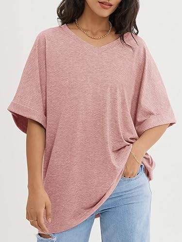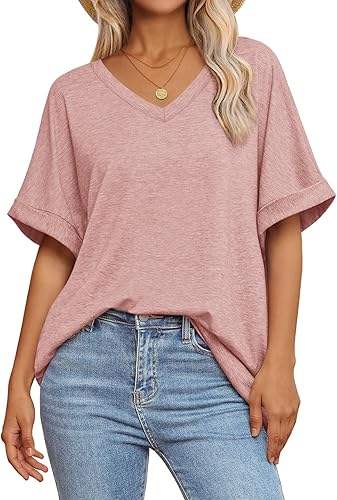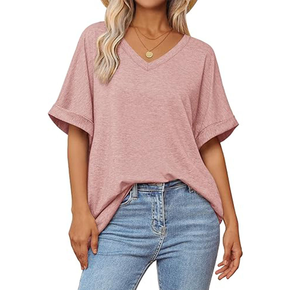 Camisetas estampadas personalizadas con cuello en V de manga corta de Color Rosa sólido de estilo caliente de verano para mujer