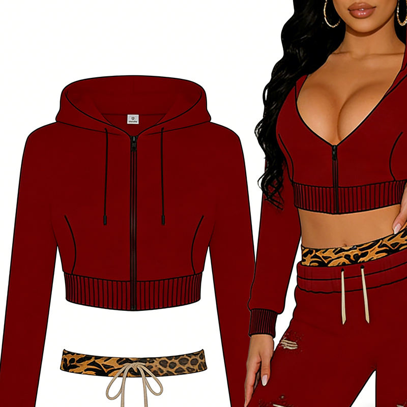 Conjunto de Dos Piezas: Sudadera Corta con Cremallera y Logotipo Personalizado, Pantalones Deportivos Anchos con Estampado de Leopardo y Cintura Elástica, Estilo Y2K para Mujer