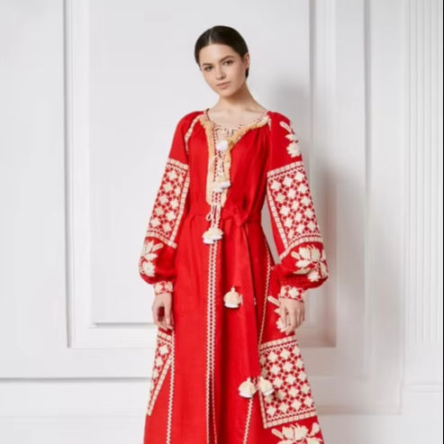 Ropa bordada ucraniana para mujer, ropa personalizada de fábrica, algodón barato bordado, Mangas de globo completas, hasta el tobillo, Maxi
