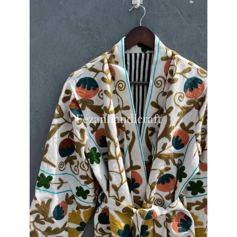 Abrigo de algodón Unisex para mujer con bordado a mano Uzbek Suzani tela otoño forro cinturón venta al por mayor ropa de fiesta Procesamiento de punto