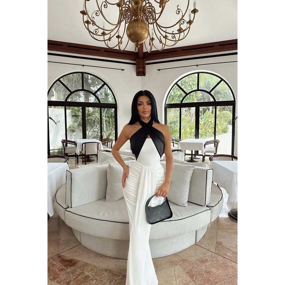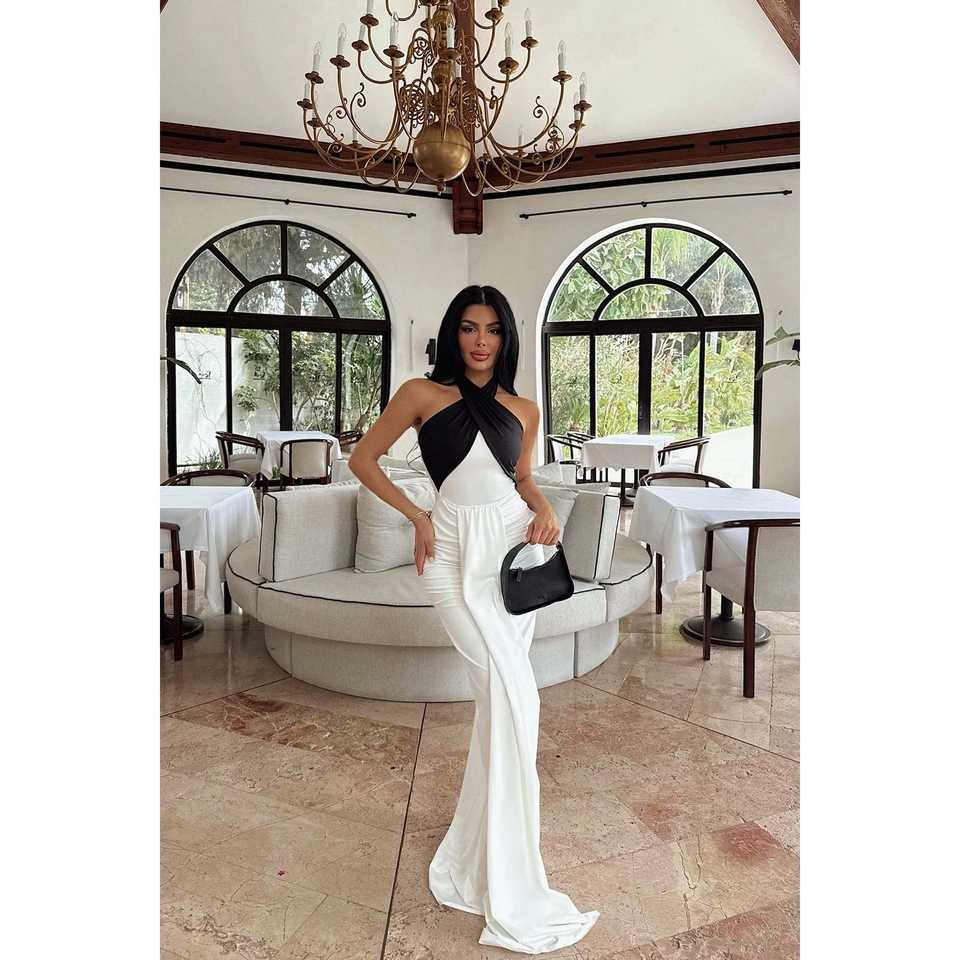 Vestido de Fiesta Blanco de Dos Tonos para Mujer, Estilo Aralia, Cintura Imperio, Cuello Alto, Largo hasta el Suelo, Talla Grande