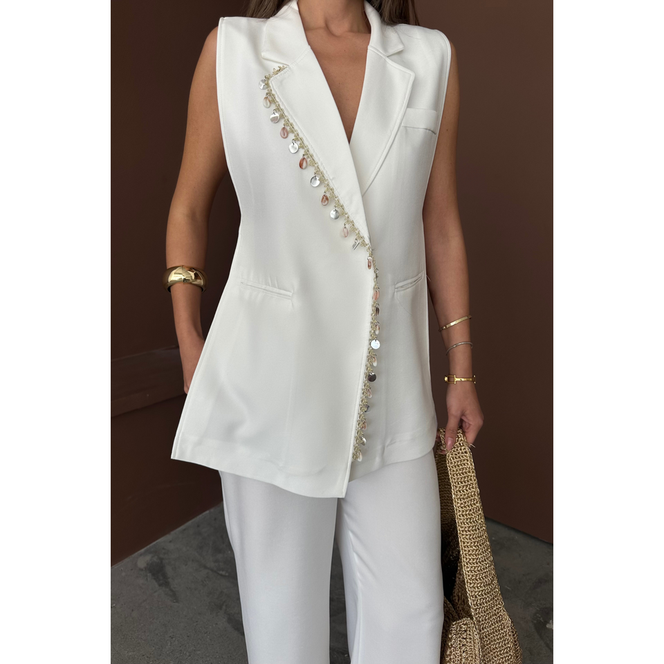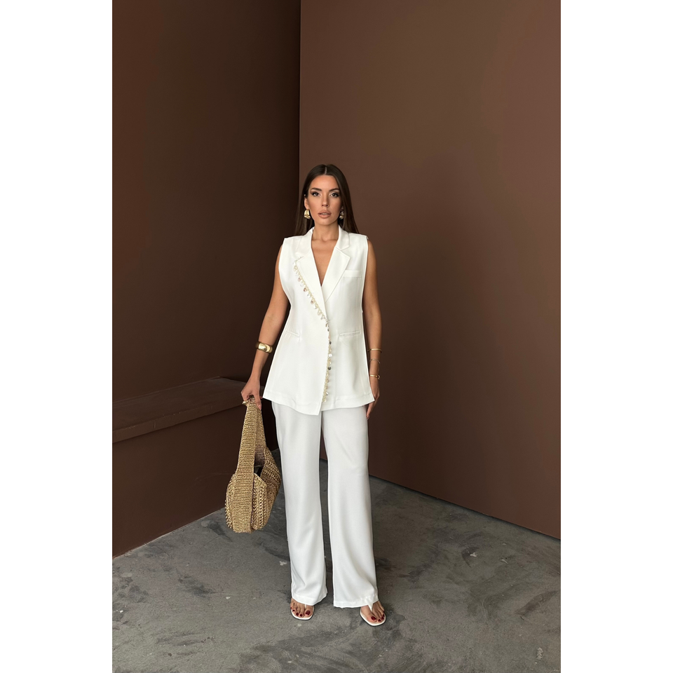 Conjunto de Lino Blanco para Mujer, Chaleco con Cuello y Estampado de Conchas de Almeja y Pantalones, Elegante y con Estilo