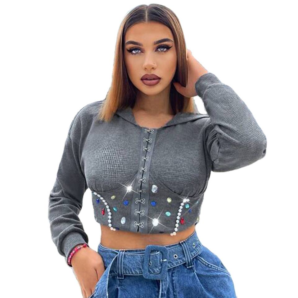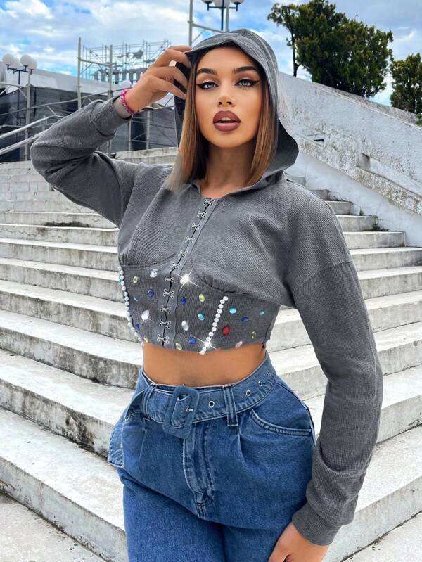 Sudadera Corta con Capucha y Encaje de Diamantes de Imitación para Mujer, de Forro Polar de Secado Rápido, Estilo Urbano, Gris, Manga Larga, Atuendo Casual y Moderno para Invierno