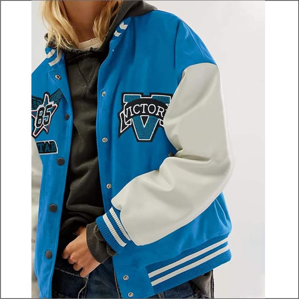 Chaqueta universitaria de poliéster de talla XL para mujer, diseño moderno con ribete a rayas y parches con letras, salidas de lana acolchadas informales de otoño