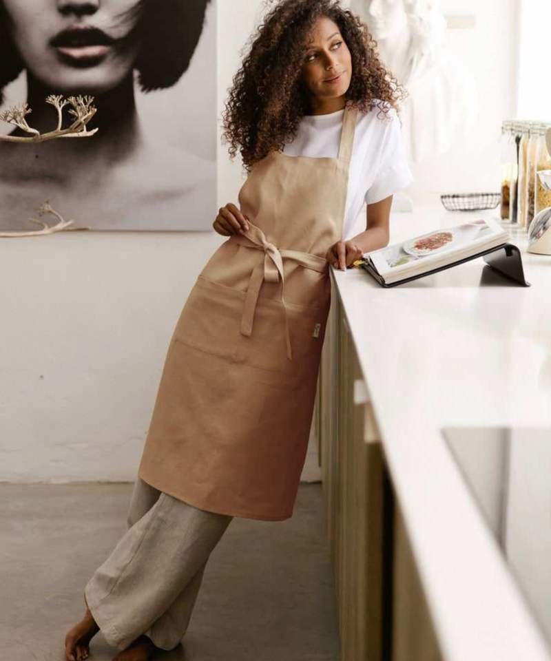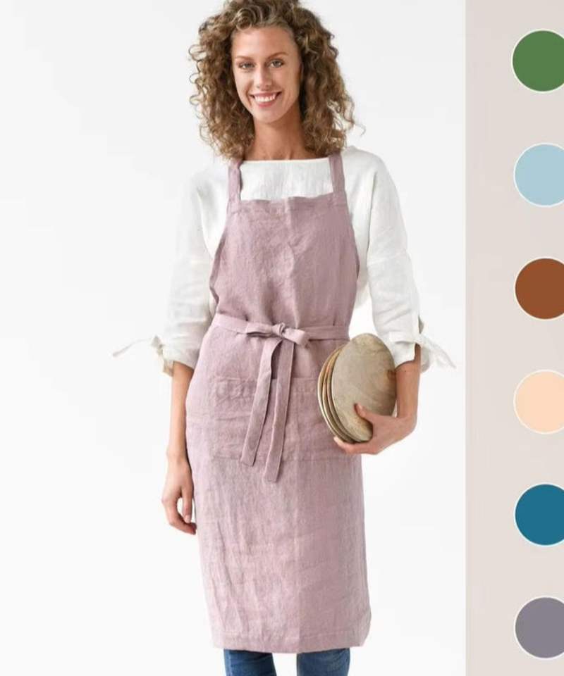 Delantal de lino para mujer con cintura larga y bolsillo, estilo de granja suave reutilizable para cocinar, jardinería, kit de lino lavado artístico